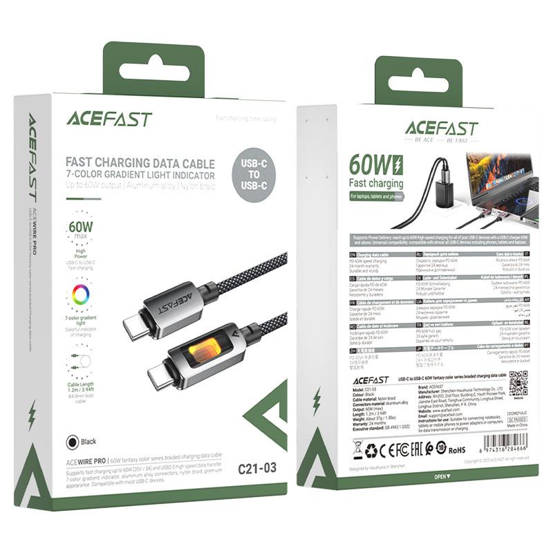 ACEFAST C21‑03 USB‑C to USB‑C 60W là cáp sạc và truyền dữ liệu cao cấp, hỗ trợ sạc nhanh Power Delivery 60 W (20 V/3 A) và truyền dữ liệu USB 2.0. Cáp dài 1.2 m, sử dụng đầu nối hợp kim nhôm và dây bện nylon chịu lực với hơn 10 000 lần uốn cong, đi kèm đèn LED 7 màu hiển thị trạng thái hoạt động, tương thích với đa thiết bị như laptop, điện thoại, tablet, tai nghe, SSD… được chứng nhận an toàn theo FCC, CE, RoHS, EAC.